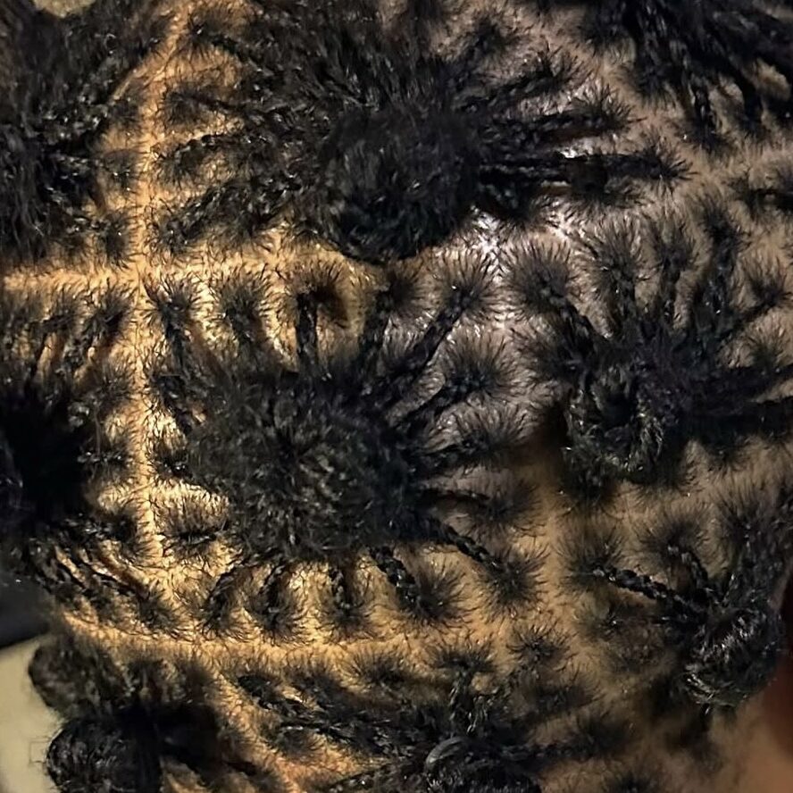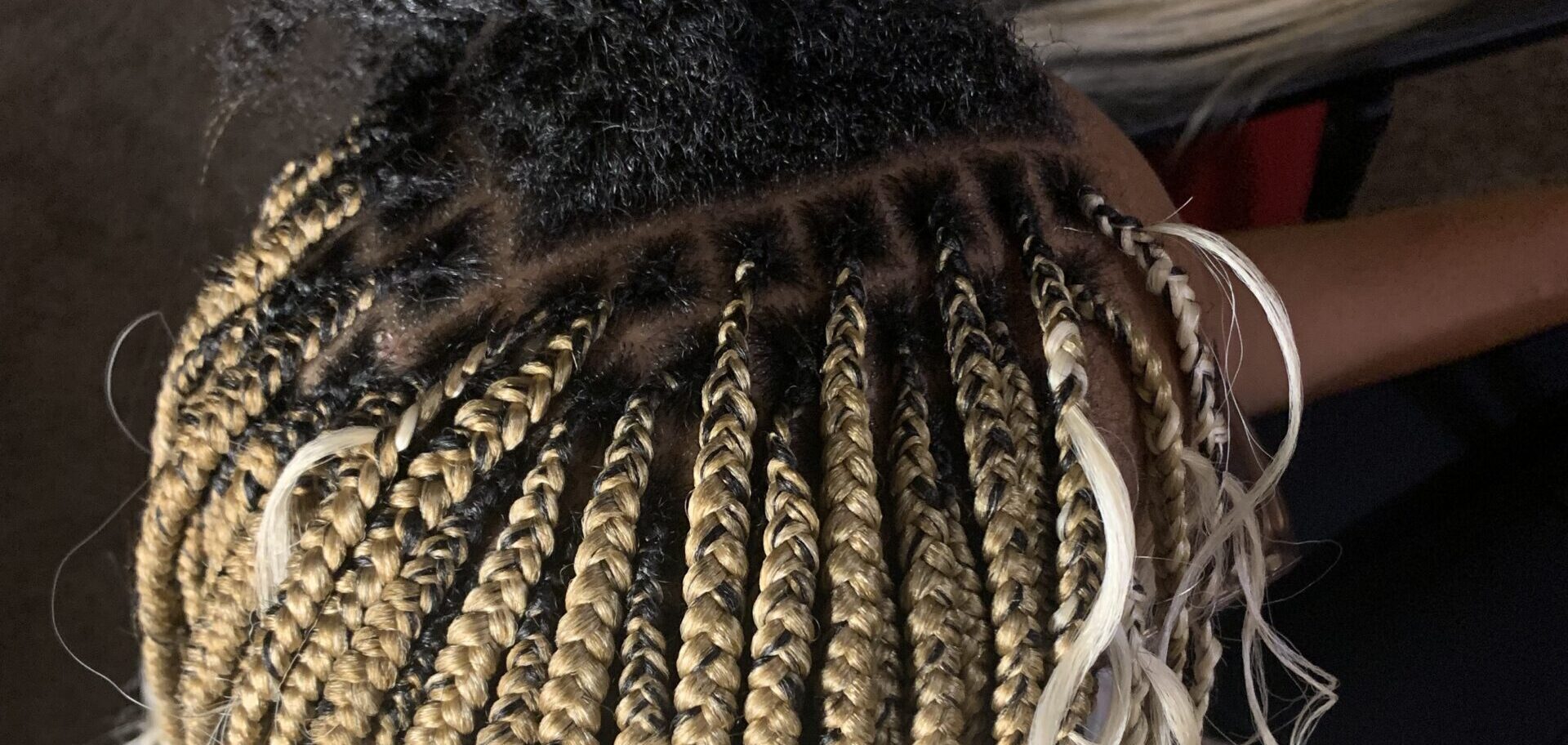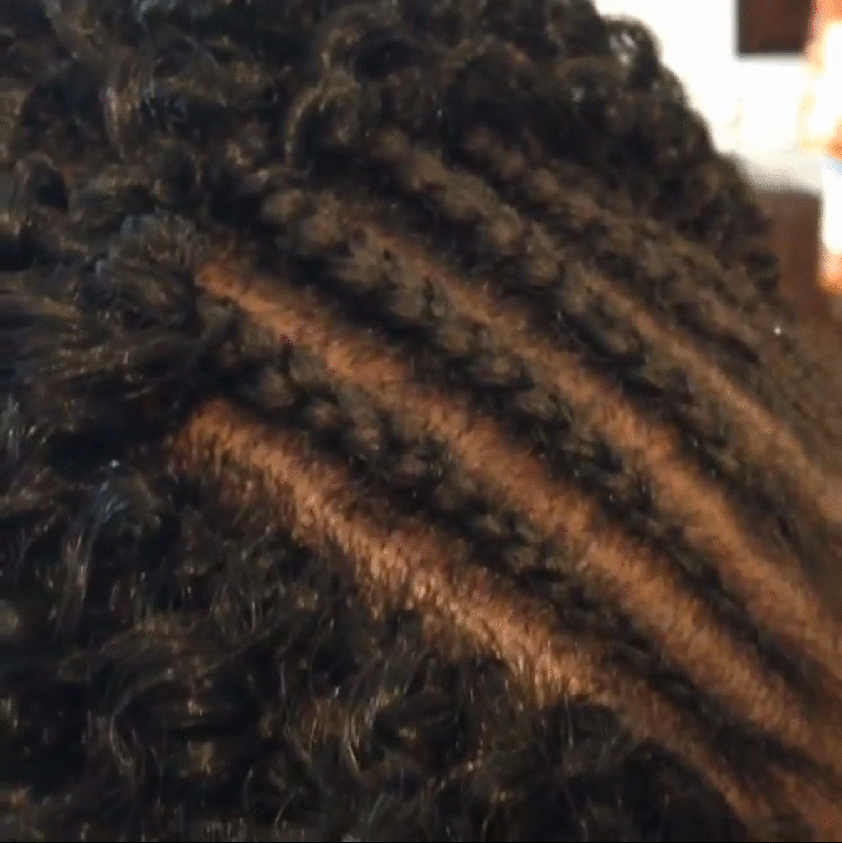 Cornrow or cornrow-based extension installation of crochet braids, feed-in cornrows, or wefted extensions.
